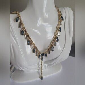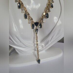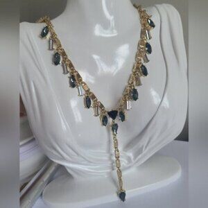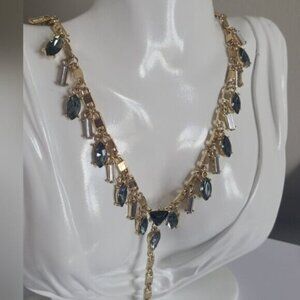 Gold Tone Blue Grey Drop Dangle Crystal Lariat Y Costume Statement Necklace