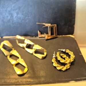 Stylish gold tone earring set featuring geometric and twisted designs. Perfect for adding elegance to any outfit.