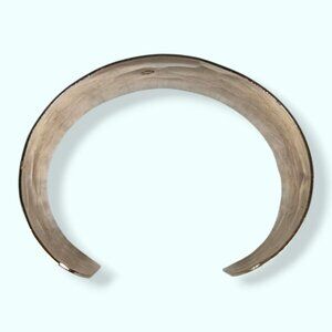 This bracelet is made of a gold tone metal and is a fixed cuff shape with an opening. The cuff has an even hammered texture all the way around and is quite tall/long. The opening is fairly narrow and the interior space for the arm/wrist is also a little narrow. The bracelet has normal wear, including some superficial marks in the metal, but no issues affecting wearability. On the interior (pic 4) there is a small round shape towards the center which I thought might be a stamp, but is actually a mark as a result of wear or handling.