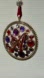 Beautiful vintage-style ornament/pendant by Liz & Co., dated 2009. Features a gold-tone beaded circular frame filled with vibrant faux gemstones in shades of red, purple, and pink. The center showcases a sparkling red scripted “A” initial. Hangs from a rich burgundy velvet ribbon with a gold-tone tag marked “liz & co.” and “2009.”