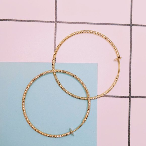 Gold Toned 2-inch Sparkle Hoop Clip On Earrings. Go casual or classy with glitzy hoops accenting any hairstyle. Spring-loaded backing makes for comfy wear that won't pinch non-pierced ears.The sparkle is from the texture of the metal, not glued-on glitter. The colour is starting to wear off the backings. Once well loved, but not my style anymore.