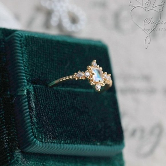 Stunning authentic Victoria style rainbow moonstone Ring with retro setting Small inclusions (minerals trapped inside the gem) prove its authenticity Delicate moonstone sparkles remarkably with bluish and purplish shimmer under the light Condition: New (Never worn) Material: Gold plated over Sterling silver, natural moonstone gemstone U.S size 6 Giftable item(Christmas Gift / Valentine's day gift/ Birthday day gift etc) Art Deco ring/Princess Ring/Cushion Cut Ring for her/Dainty Ring