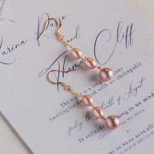 Gorgeous handmade pearl earrings featured by a row of three unique irregular genuine pinkish earrings, a unique style that would hardly be found anywhere else