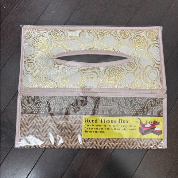 Elegant tissue box with gold and cream floral design still in packaging. Originally purchased in Thailand.