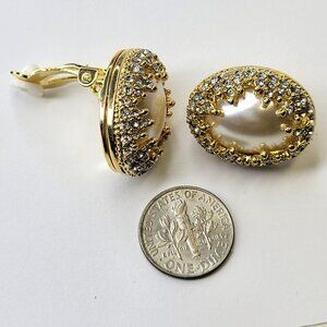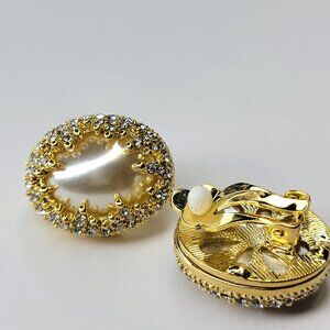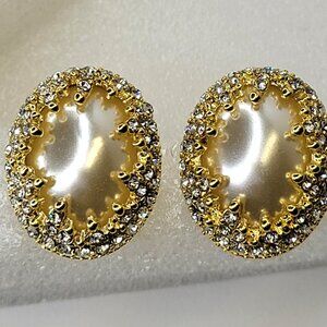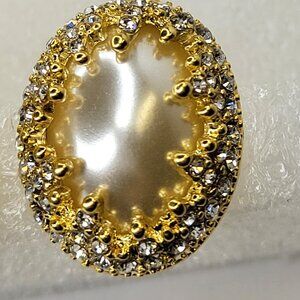 Oval white pearl like cabochon with "gold" frame encrusted with crystal rhinestones