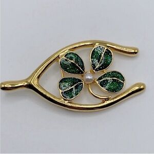 Elegant gold brooch featuring a green clover design with a pearl accent. Perfect for adding a touch of nature-inspired elegance to any outfit.