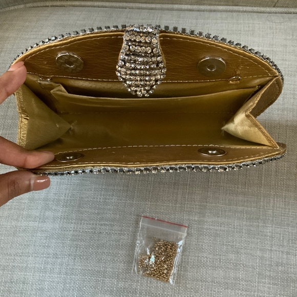 Evening clutch with gold coloured beads and rhinestones. Perfect for evening event or the holidays. The pictures do not capture how sparkly this clutch is!!!