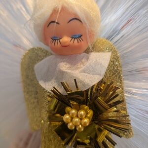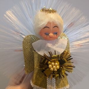 Charming angel tree topper in gold and white. Features a radiant design with a golden star detail.