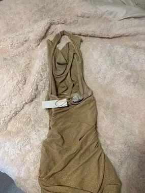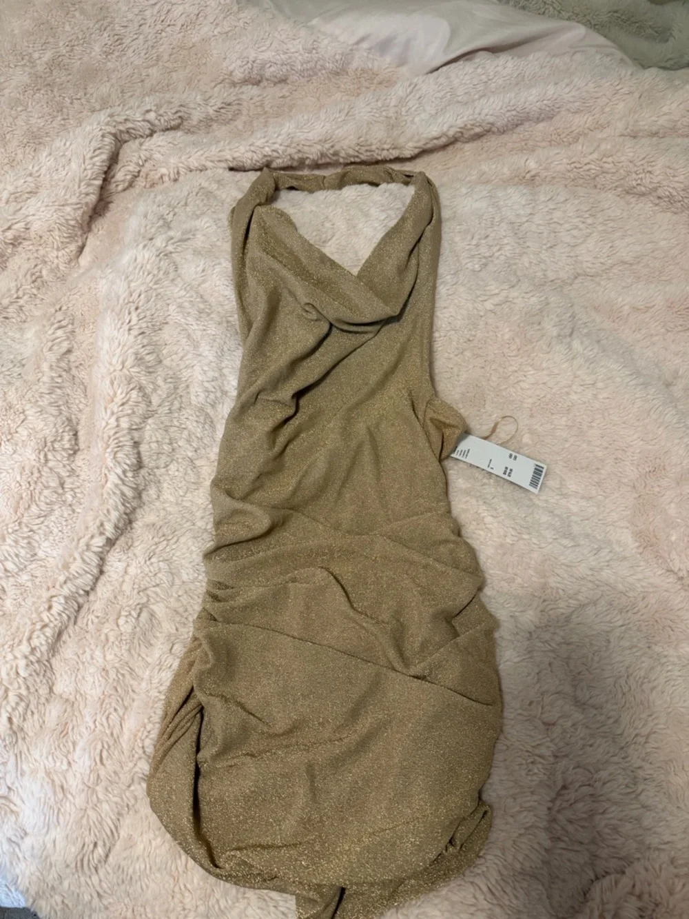 Backless dress with a soft cowl neckline. Ruched skirt creates a flattering silhouette. Subtle metallic shimmer throughout. Sleek, evening-ready style.