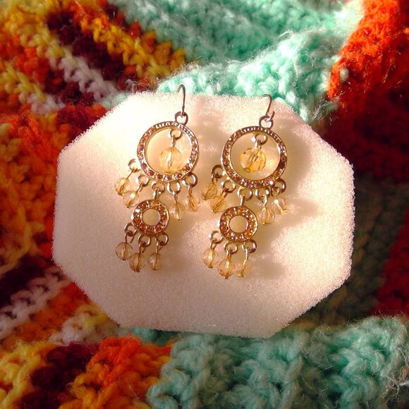 I have a pair of gold coloured metal earrings - cute for creating a pretty Bohemian Western look! :D They are light and dainty. Each earring has two circle shapes with golden yellow rhinestones and eight light yellow beads. The overall effect is a warm champagne glow! ^_^ The earrings have a lot of shine! Brand not visible. Listed at this price as there is some light metal discolouration on the bottom of one earring, shown in the last picture. All golden rhinestones and beads intact!