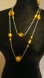 Extra long necklace with various shaped glass beads with gold coloured effect inside.