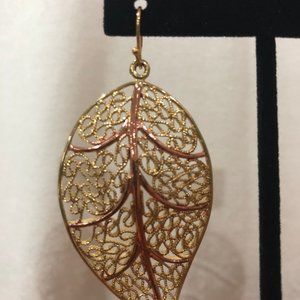Gold finish leaf motif earrings with filigree detail and rose gold veining