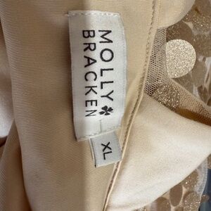 Narrow strap dress with some slight stretch. Large round gold sequins. Molly Bracken designer. Narrow straps cross in the back. worn twice.