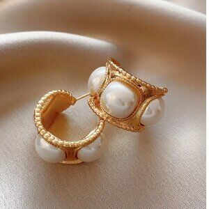 Gold plated Hoop Earrings - With Faux White Pearls - NEW