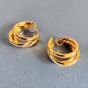 Gold tone large triple loops clip on earrings.