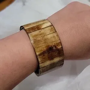 Beautiful full cuff, gold/brass interior with brown tortoise shell panel design. Large, so easy to put on, but not easy to slide off. Can also be worn higher on arm.