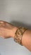 Bracelet with an open cuff style that can adjust slightly depending on wrist size. This piece is not real gold but has the appearance of a polished gold-tone accessory. Slightly flexible, making it easy to slip on and off.