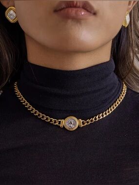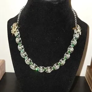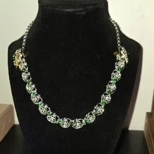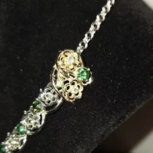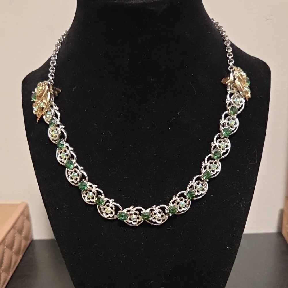Delicate gold-tone chain with linked floral motifs. Sparkling green crystal accents add vibrant color and refined shine. Lightweight and versatile for day or evening wear. Designed to complement a variety of outfits with a touch of elegance.