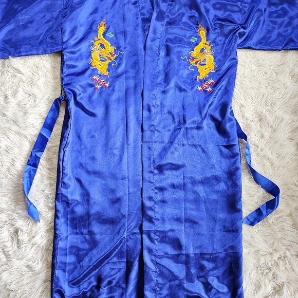 Check out this Golden Dragon Unisex Blue Satin Asian Dragon Embroidery Long Bathrobe Kimono Gown in excellent pre-owned condition, no rip or stains on it.