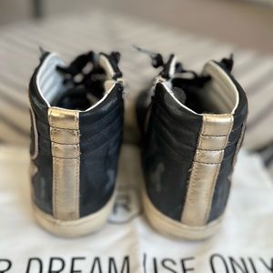 Paneled high top buffed leather, suede and textile in black and gold. Smudging and distressed throughout.