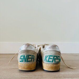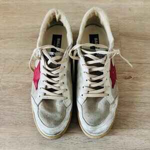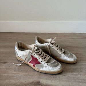 Barely used, men's Golden Goose Ball Stars in grey suede with red star and silver/green heel.