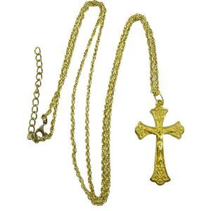 Large statement crucifix necklace. Very good condition - clasp has been replaced. Necklace is 36" long + 3" extender chain. Crucifix is 1 1/4" x 2". Crucifix is marked "Pewter" on the back.