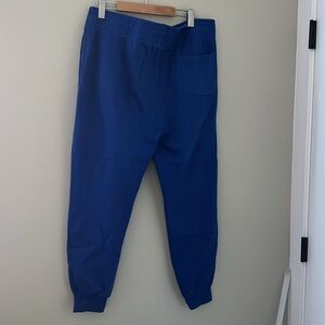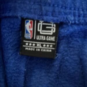 These sweatpants feature a vibrant blue color with striking yellow accents, including the iconic Warriors logo and text. Designed with an elastic waistband and cuffed ankles, they offer a comfortable fit ideal for athletic activities. Made from soft fleece material, these joggers provide warmth and style for any GSW fan. Pants are in good condition sized Extra Large, waist length is 19 inches hip width is 23 3/8 inches and pants length is 40 inches