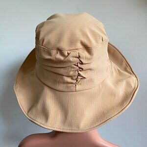 Golden Tan Wire Brim Adjustable Ruched Crown Hat. Packable & foldable with wire brim that allows you to shape it just the way you like. Interior with breathable mesh and drawstring for customizable fit. Interior circumference 24", Brim 3". Condition is like new, From a smoke free/pet free home.