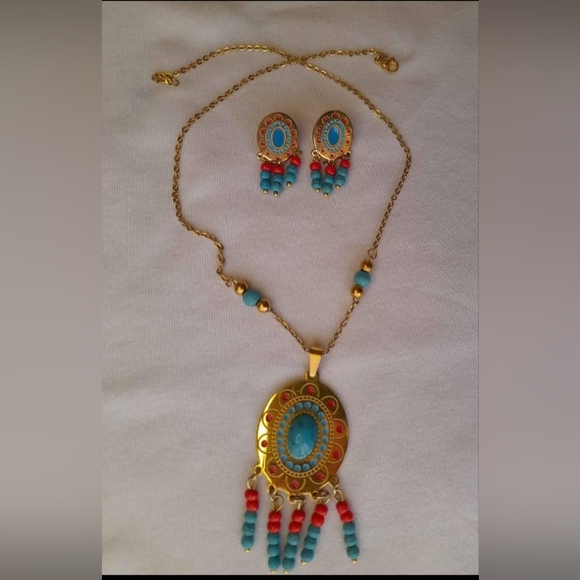 Elegant golden and turquoise jewelry set featuring a stunning necklace and matching earrings. Perfect for adding a touch of sophistication to any outfit.