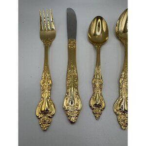 Vintage Ornate Gold Plated Northcraft + Royal Sealy Flatware/Silverware - Made In Japan - Stainless Steel - Sold Separately. All utensils have a similar floral and scroll pattern. In good vintage/used condition - minor wear can be seen. Please see all photos.