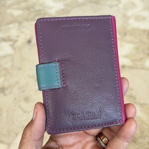Never used, Golunski RFID leather card case. Beautiful multi colour full leather exterior, snap tab closure, interior has plastic sleeves to hold up to 12 credit cards. Plus two clear ID pockets perfect for drivers license and medical card ?
