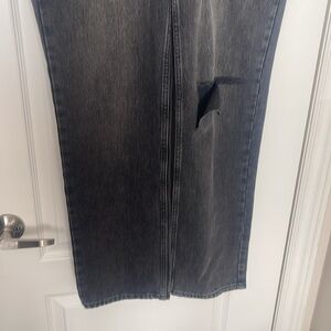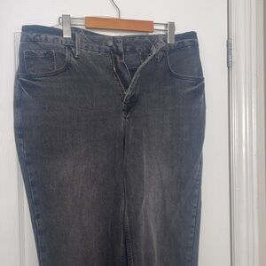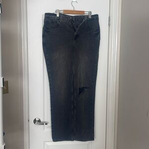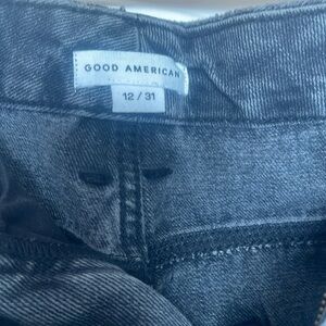 The Good 90s Icon Jeans from Good American are a high rise jean with a zip fly. They have a straight leg and non-stretch fit. They are in a black wash with a ripped knee. They are brand new with tags.