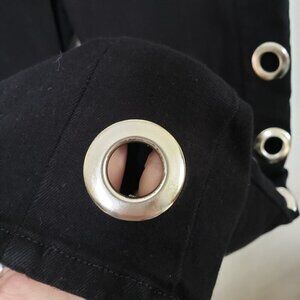 Oversized silver grommet detailing at side, cross loops at center back, v shaped yoke at back