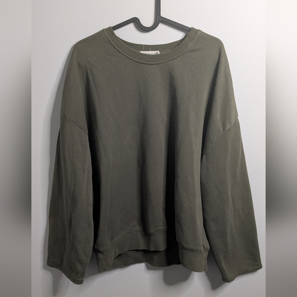 Olive green lightly heathered (photo 3) sweatshirt from Good American. Cotton blend, slightly oversize and cozy with wide arms (no cuffs).