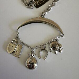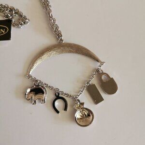 Very very cute necklace of a crescent shape with 5 dangling charms, including a lock with a heart, a domino, a cash bag 1,000, a horseshoe, and an elephant