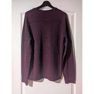 A notched, crossover v-neck sweater in fine gauge merino wool knit with fine craftsmanship details that include exposed seams along the armholes and sleeve.