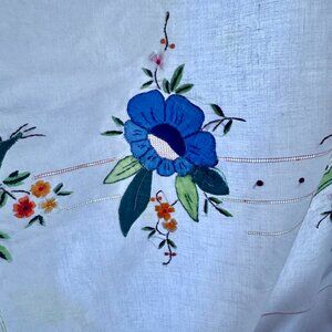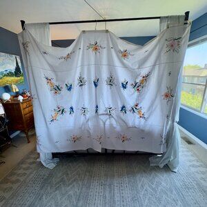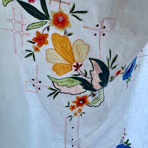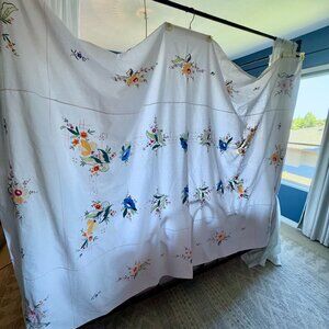 Large multicoloured vintage floral tablecloth, embroidery is so wonderfully done and vivid. Feels 100% cotton/linen. Has some yellowing marks in places as shown in photos, and the two black dots as shown in the second to last photo. Measures 82 inches by about 101 inches. Cat friendly, nonsmoking home.