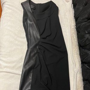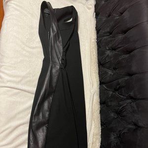 Such a unique and flattering piece! Asymmetrical shoulder, leather all the way down one side and ruched waist. Has a fair amount of stretch.