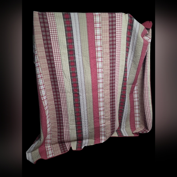 Cozy blanket with red, cream, and black stripes. Perfect for adding warmth and style to any room.