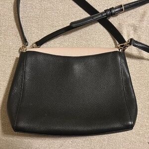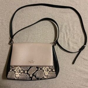 Unique, stylish black, tan and snakeskin leather purse in excellent pre-loved condition. Comes with 2 straps so can be a crossbody or shoulder bag. Gold hardware. Flap magnet closure, zippered pocket inside.
