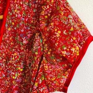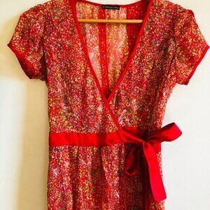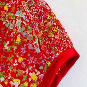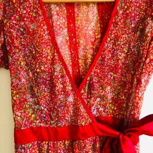 Beautiful red gauzy fabric with sweet floral print and different textures. Wrap dress with red satin sash (tie inside as well). Dress is adjustable due to wrap waist, however the pit to pit measurement is 20" and the seam to seam across the bust is also 20" when laid flat. The length of the dress from top of shoulder seam to bottom hem is 41".