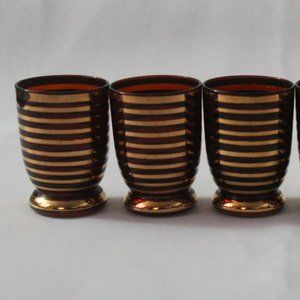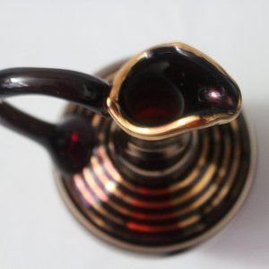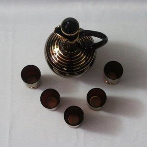 With alternating gold bands, the set is visually striking. The footed base, spout, and stopper feature wider bands. Height of the decanter to the stopper is 10". Length to handle is 5". Capacity is 800 ml or 27 ounces.