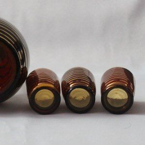 Each glass is just over 2 1/4" tall and holds nearly 2 ounces. The set is in very good condition. The stopper does have a chip at the bottom that's only visible when you remove it from the bottle.