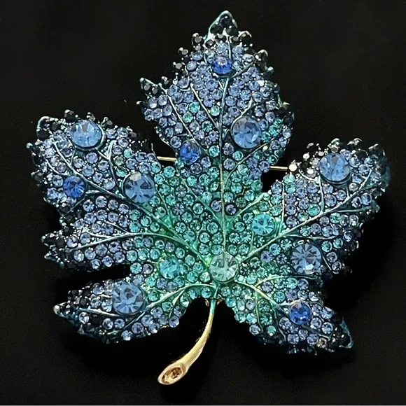 Very beautiful and sparkling dews on maple leaves brooch adorned with blue and green rhinestones π
