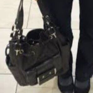 Michael Kors black leather with silver trim and buckle on outside pocket. And chain links on the straps.