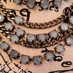 This stunning multi-layered necklace features elegant brass chains adorned with light teal stones. Perfect for adding a touch of sophistication to any outfit. one stone is missing please see the pictures.