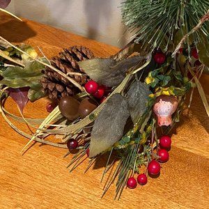 Stunning holiday/Christmas wreath with pine, holly berries, acorns, pine cones and other greenery. Really lovely and natural looking -- not overdone. Pine cones are real, but the rest is artificial, but AMAZINGLY real looking. Beautifully made.