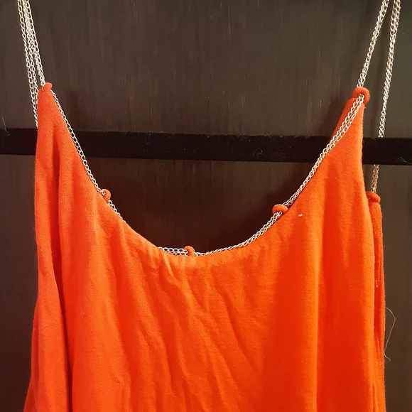 Striking orange ruched very flattering dress with elegant chain accent. Ideal for making a statement. picture doesn't do justice , when on its all ruched.... so sexy and flattering ...