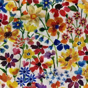 The print was painted in oils in an Impressionistic style in the Liberty Fabric studio. It's high summer meadow flowers including daisies, primroses, cornflowers, daffodils and forget-me-nots. The colours are vivid against a white background and include bright yellows and oranges, periwinkle blue, poppy red and violet.