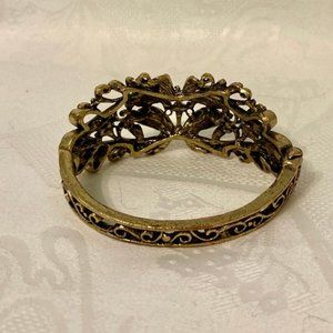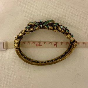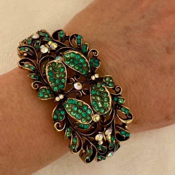 Over-the-top glam! Hinged bracelet with bright green rhinestone butterflies set in antique gold tone.